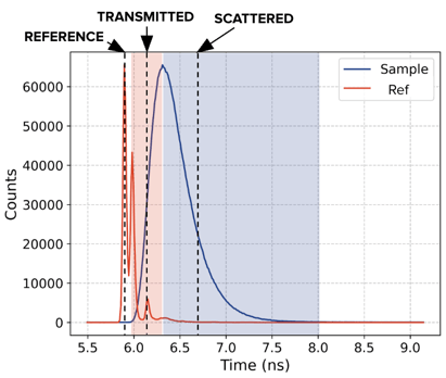 Our reference measurement tells us photon times of arrival from our illumination source without traveling through a sample. We look for the strongest, earliest peak arriving at our sample to calibrate photon travel times in the measurement system.